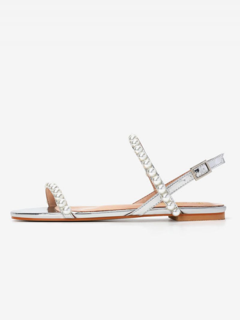 Damskie Buty Ślubne Pu Skóra Srebrne Open Toe Perły Płaskie