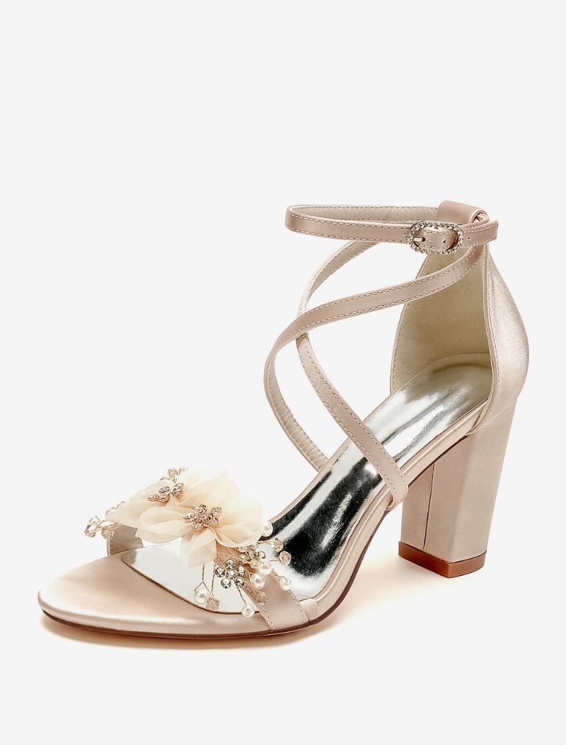 Damskie Buty Ślubne Satynowe Białe Kwiaty Sandały Z Odkrytymi Palcami
