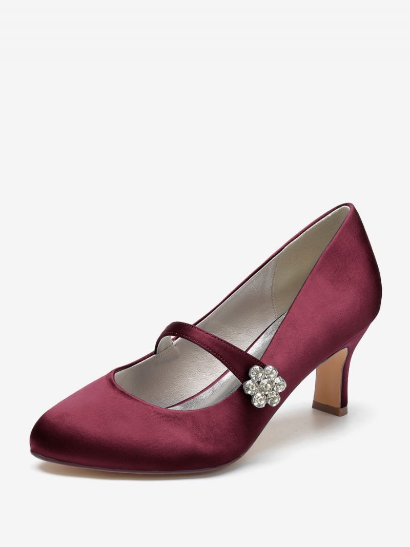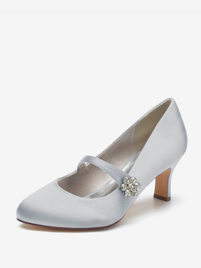 Damskie Buty Ślubne Satynowe Białe Okrągłe Noski Cyrkonie Gruby Obcas W Stylu Vintage