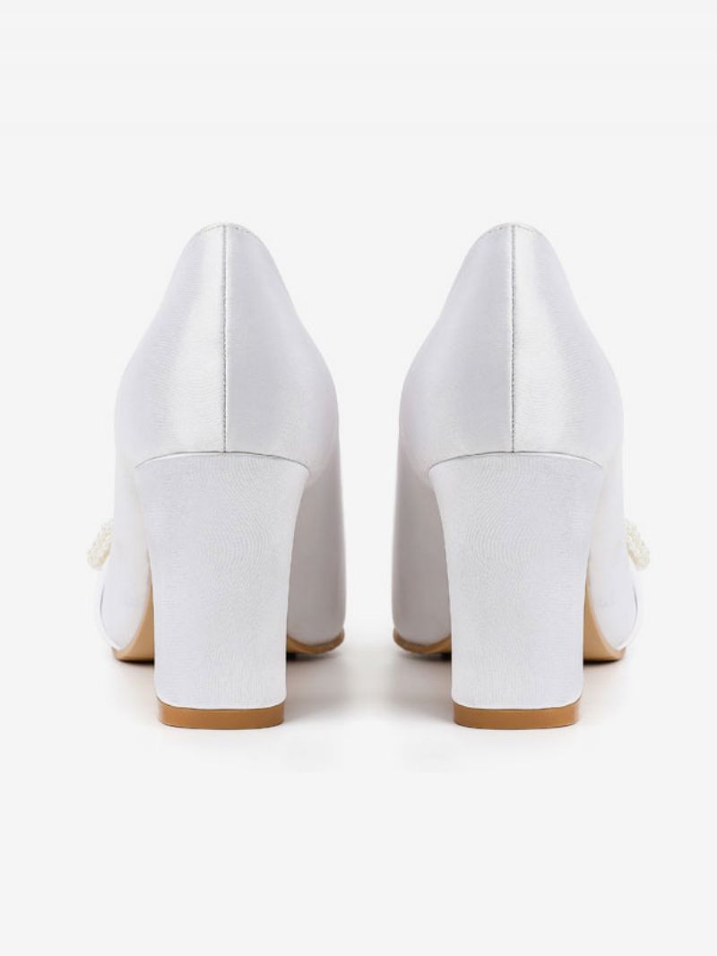 Damskie Buty Ślubne Satynowe Białe Szpiczaste Noski Perły Na Grubym Obcasie