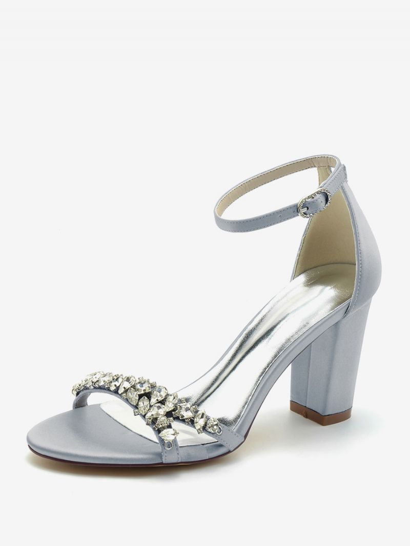 Damskie Buty Ślubne Satynowe Białe Z Odkrytymi Palcami Kryształkami Na Grubym Obcasie