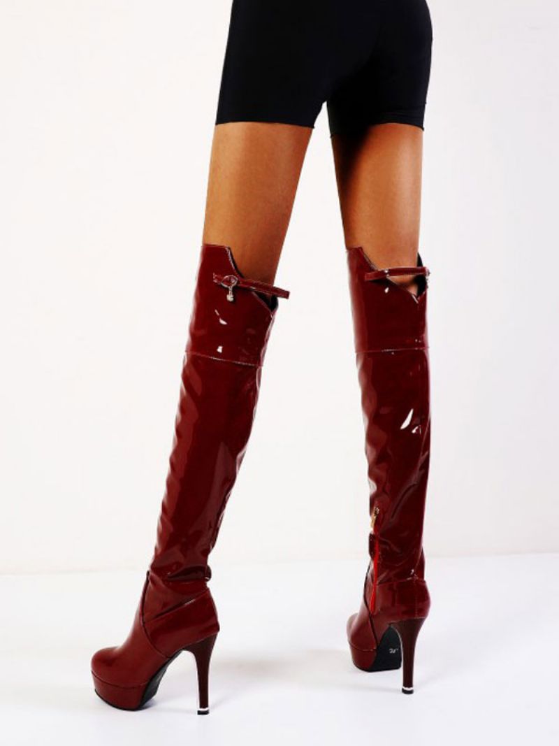 Damskie Buty Za Kolano Wysokie Obcasy Na Kolanach Białe Lakierowane Górne Jasne Skórzane Z Okrągłym Wiązaniem