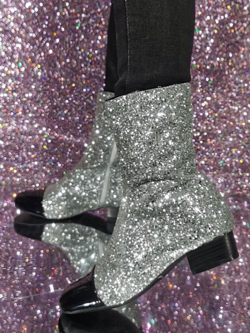 Damskie Cekinowe Botki Na Obcasie Typu Szczenię Z Okrągłym Noskiem