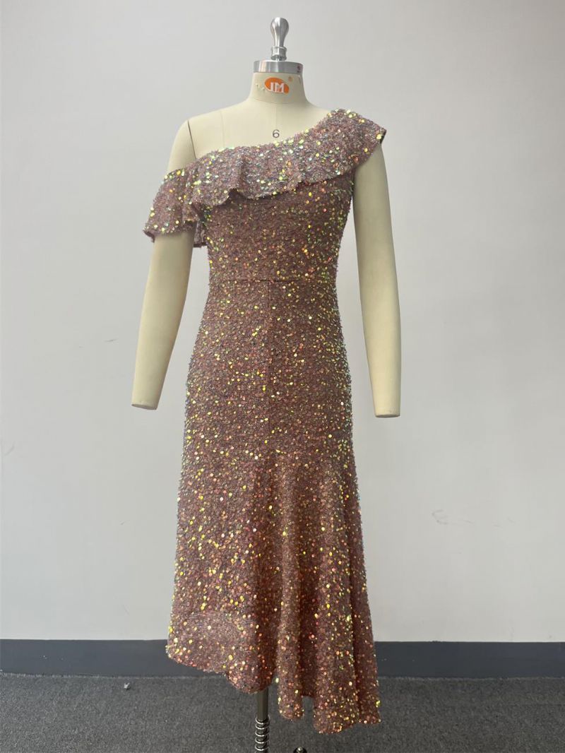 Damskie Cekiny Asymetryczna Sukienka Z Falbankami Na Jedno Ramię Sukienki Midi Studniówkę