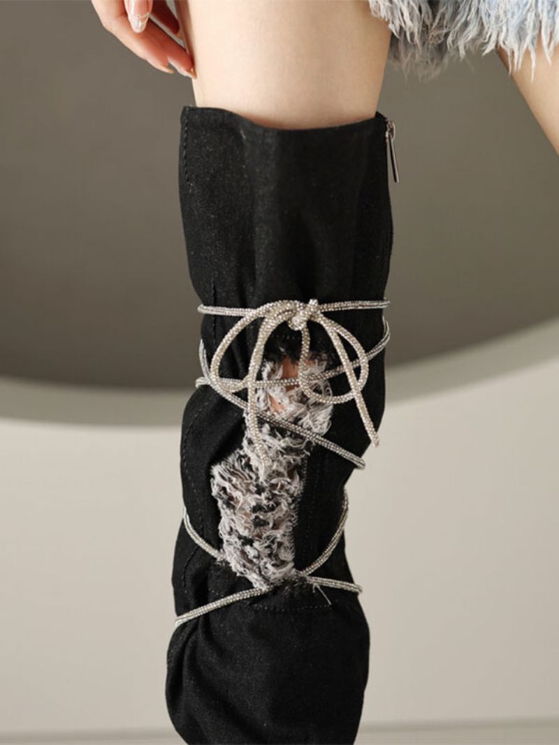 Damskie CZarne Buty Za Kolano Sznurowane Letnie Z Kryształkami