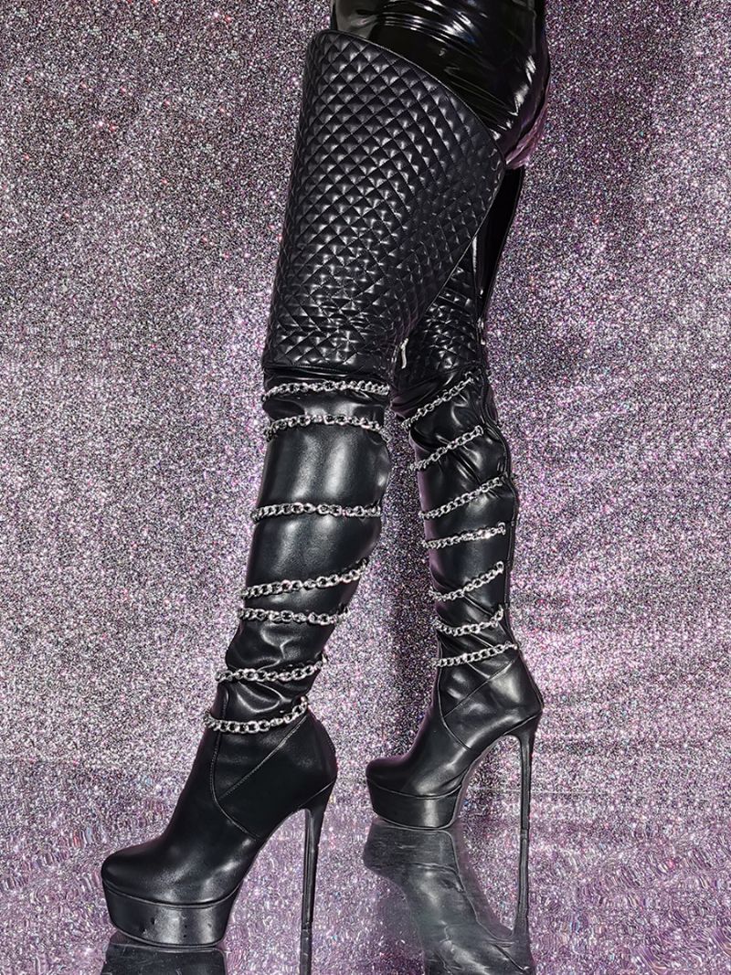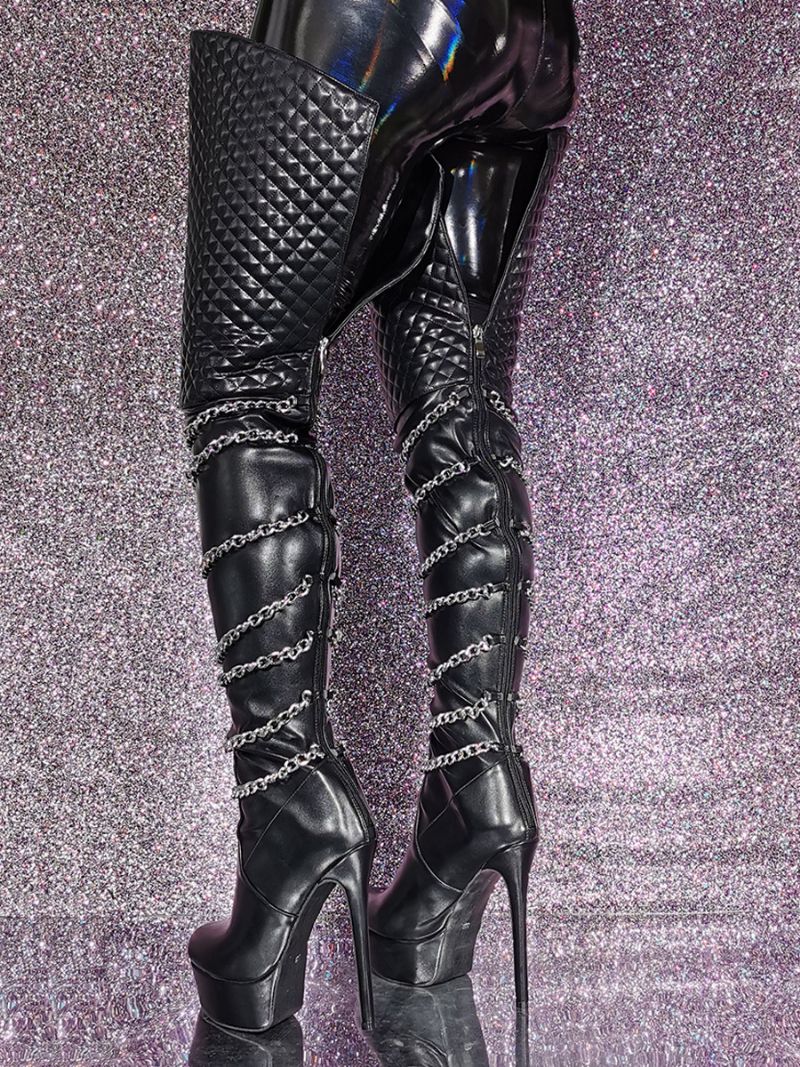 Damskie CZarne Buty Za Udo Wysokie Obcasy Metalowe Detale Seksowne Kolano