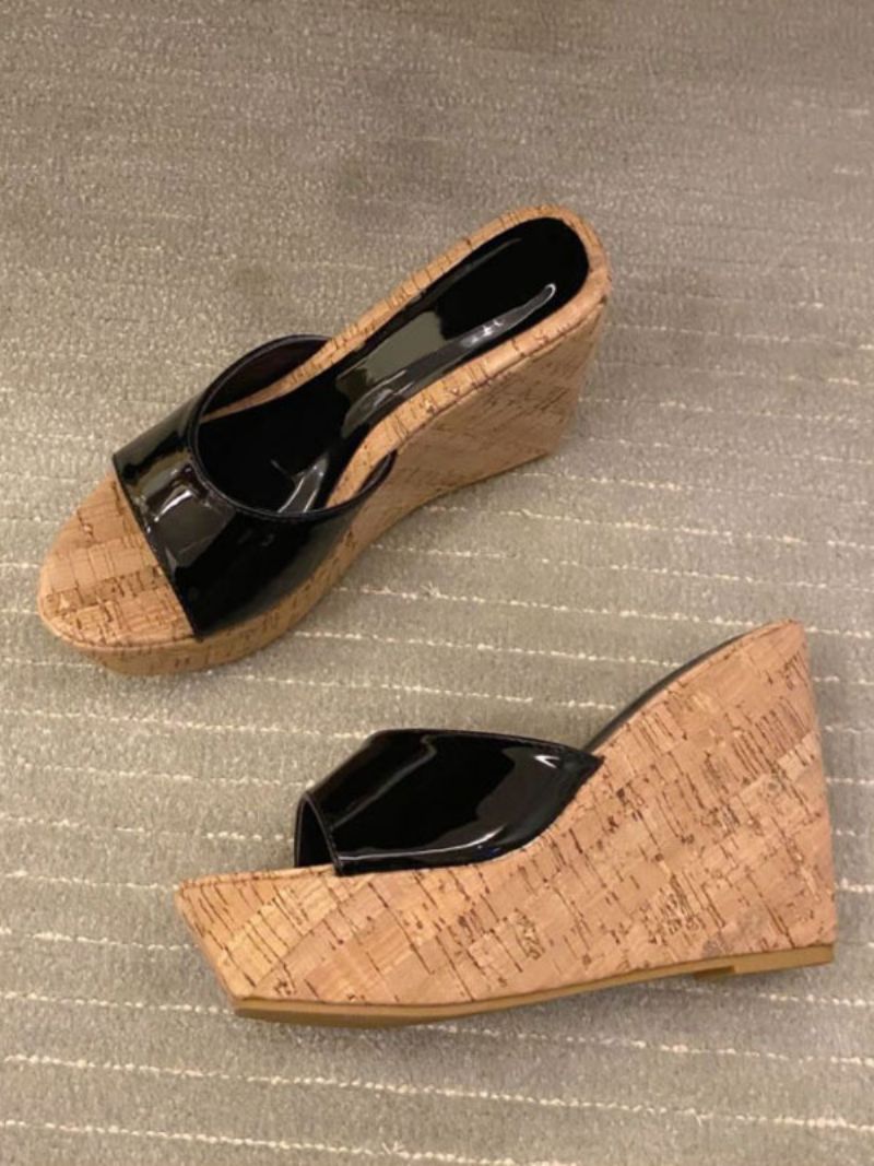 Damskie CZarne Klapki Peep Toe Na Koturnie Obcas Patentowy Pu Letni Pantofel Obcasie