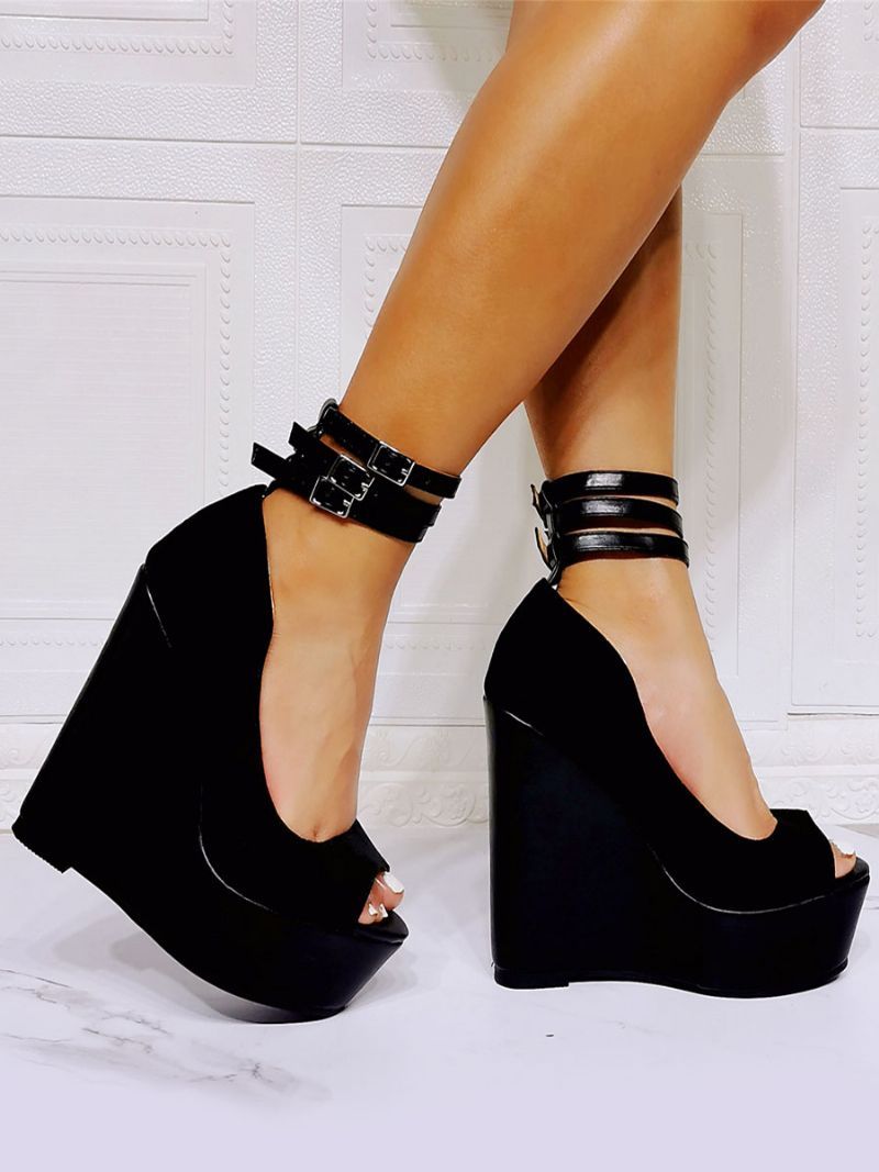 Damskie CZarne Sandały Na Koturnie Peep Toe Obcas Mikro Zamszowe Obcasie Z Paskiem Kostce