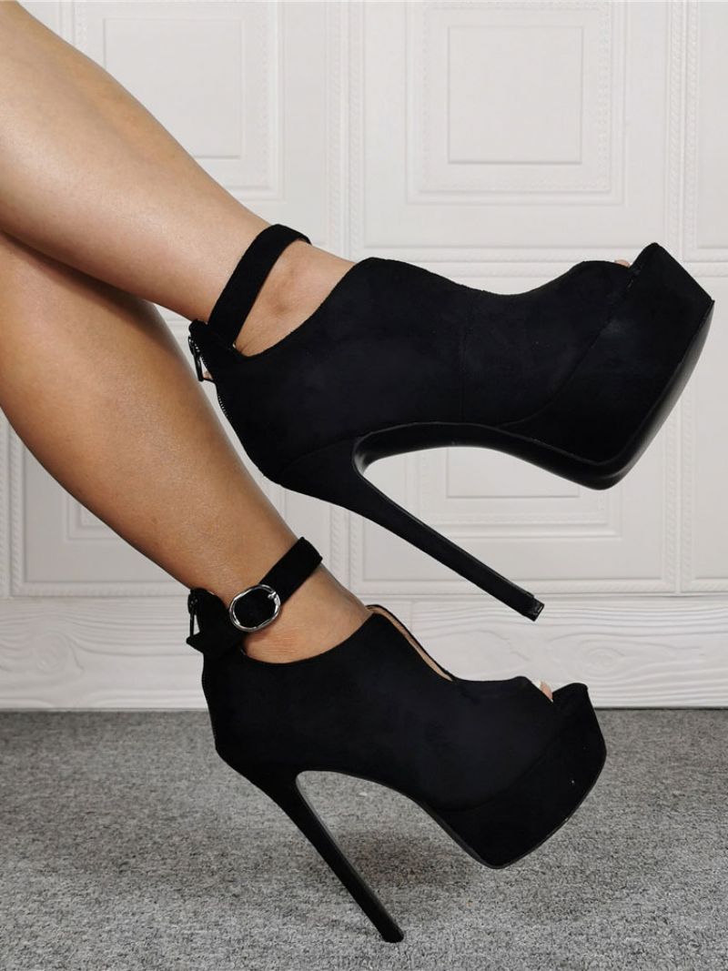 Damskie CZarne Zamszowe Buty Letnie Peep Toe Platforma Na Szpilce Z Paskiem Kostkę