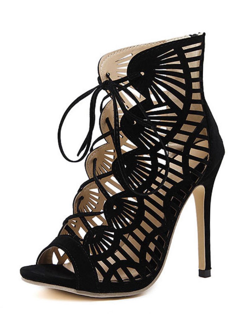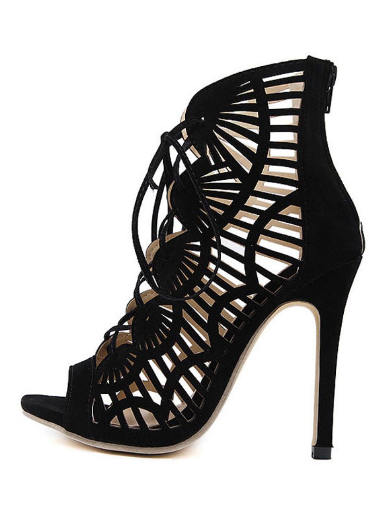 Damskie CZarne Zamszowe Sandały Gladiatorki Z Wycięciem Sznurowane Na Szpilce