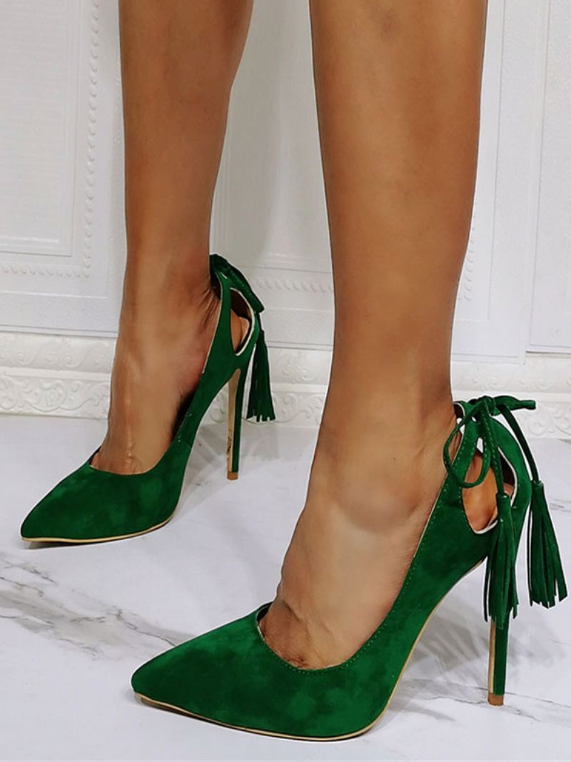 Damskie CZółenka Na Szpilce Z Frędzlami I Szpilką Zielonego Zamszu