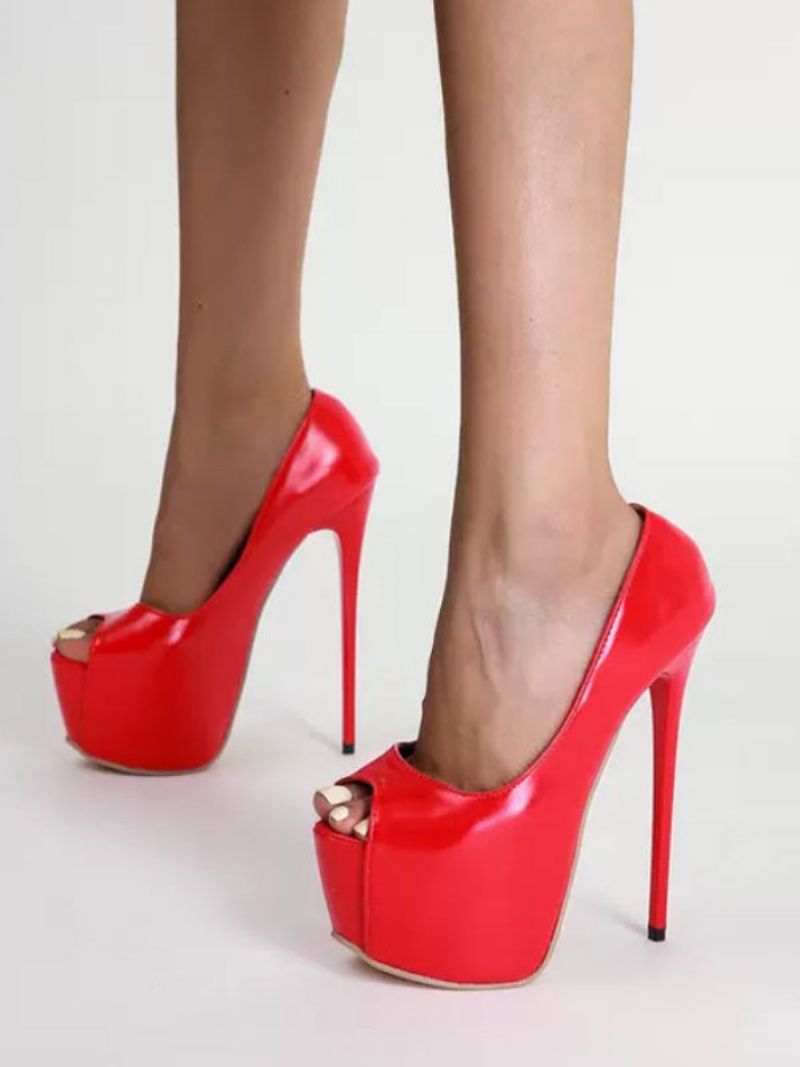 Damskie CZółenka Na Wysokim Obcasie Pu Skórzane CZerwone Peep Toe Buty Wieczorowe