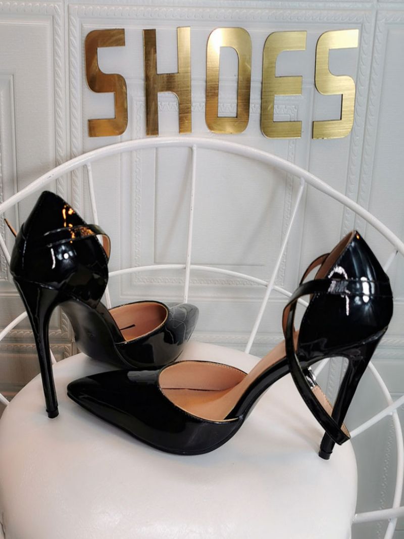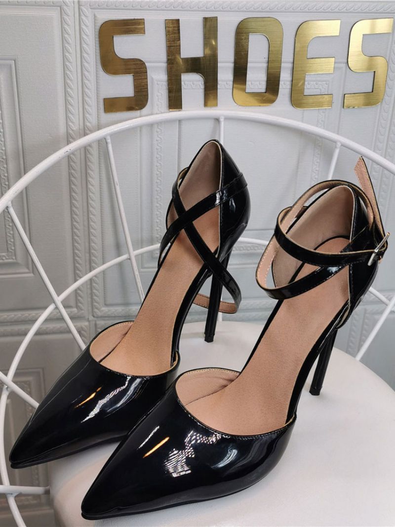 Damskie CZółenka W Dużych Rozmiarach Szpiczaste Noski Szpilka Patent Pu Leatehr Modne CZarne Szpilki Z Paskiem Na Kostce