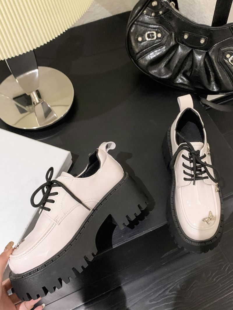 Damskie Metalowe Detale Oksfordki Na Grubym Obcasie Z Okrągłym Noskiem I Lakierowaną Skórą