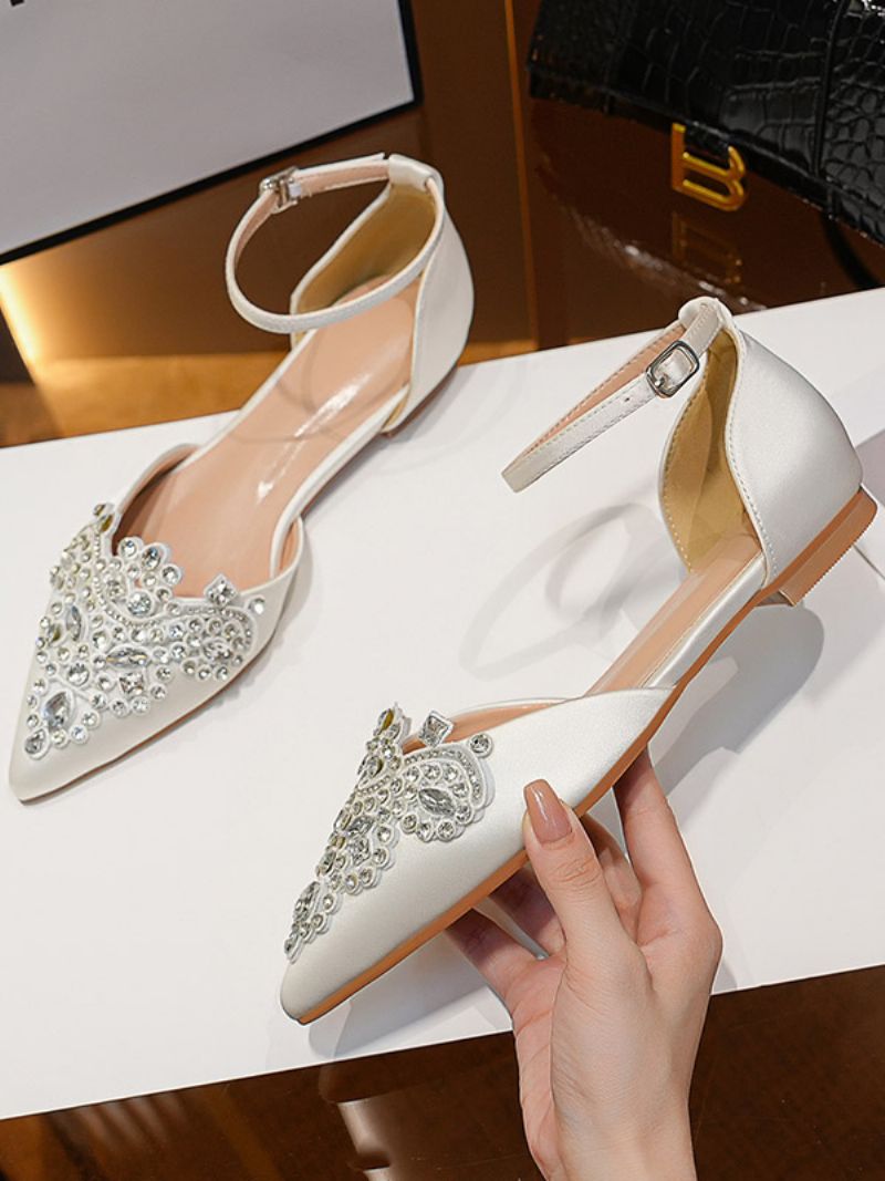 Damskie Płaskie Buty Ślubne Ze Szpiczastym Noskiem Dżetów Z Paskiem Na Kostkę