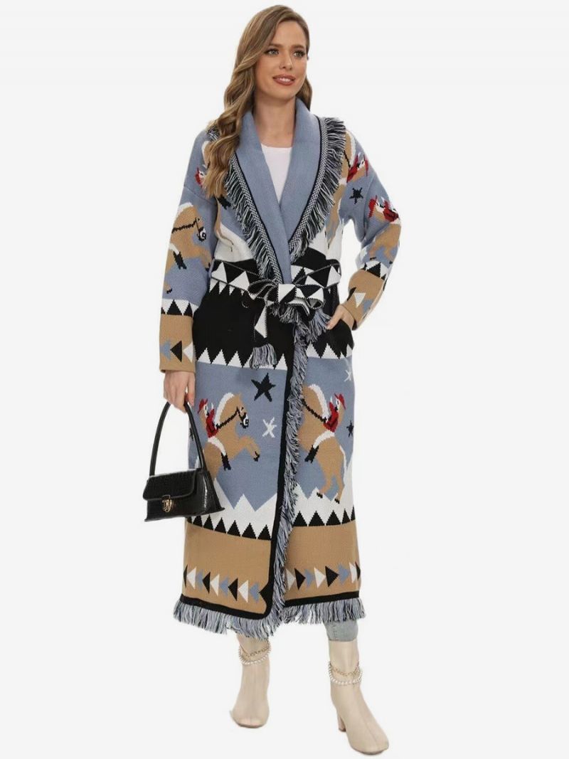 Damskie Żakardowe Kardigany Z Frędzlami I Paskiem Domieszką Wełny Boho O Długim Kroju