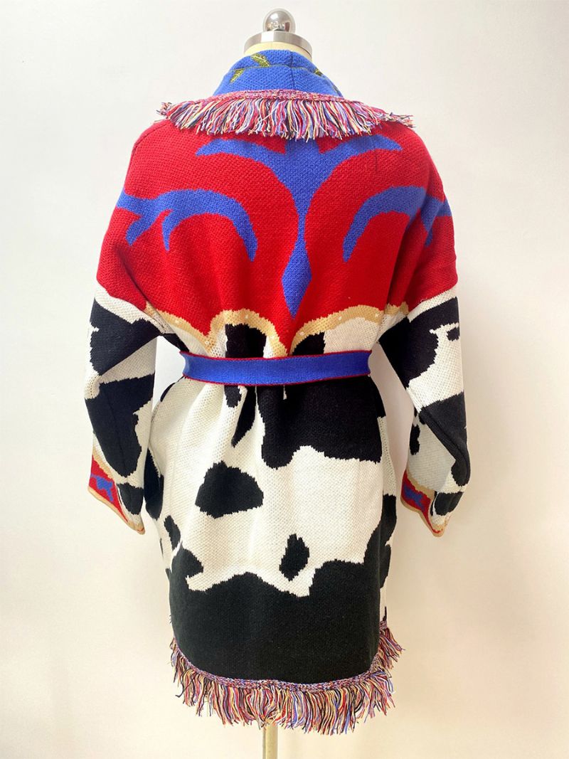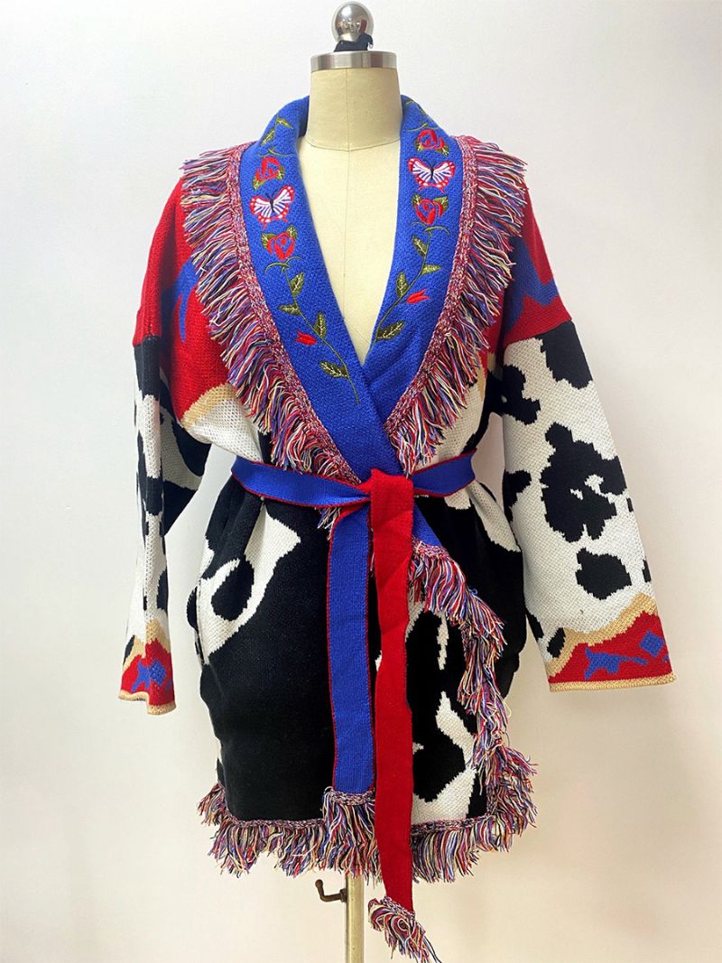 Damskie Żakardowe Kardigany Z Frędzlami I Paskiem Domieszką Wełny W Stylu Etnicznym Boho