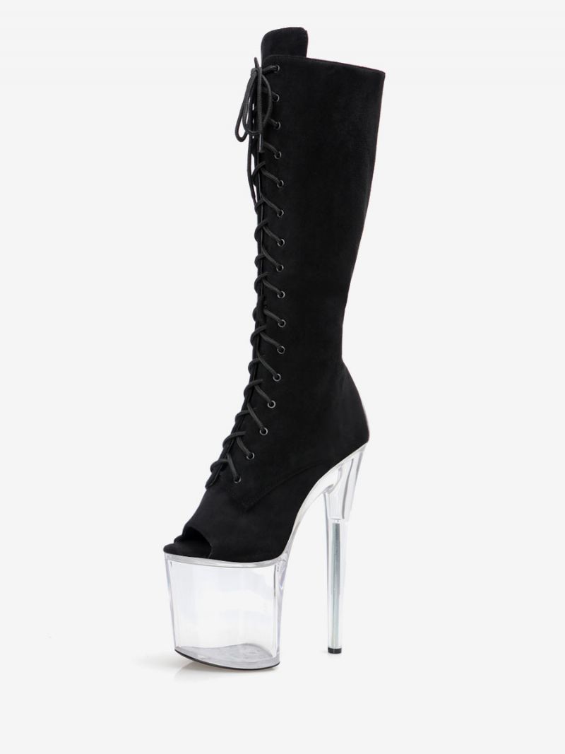 Damskie Seksowne Buty Okrągły Nosek Zamek Geometryczne Szpilki Taniec Na Rurze CZarne Zakolanówki Do Kolan