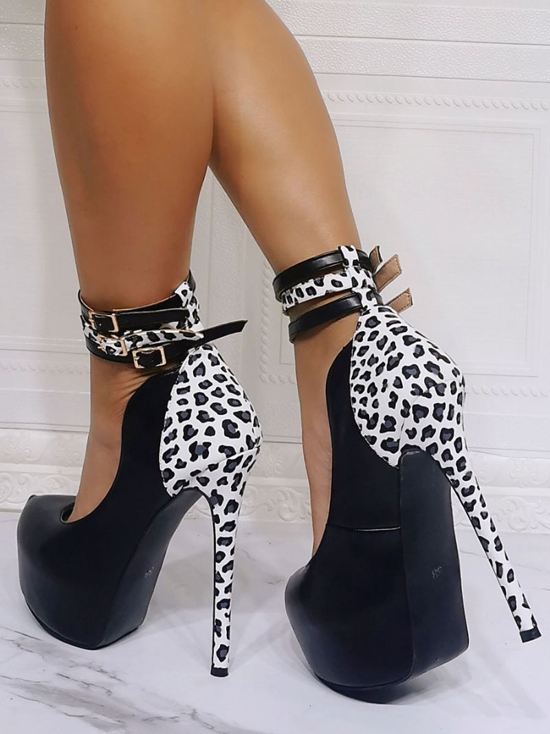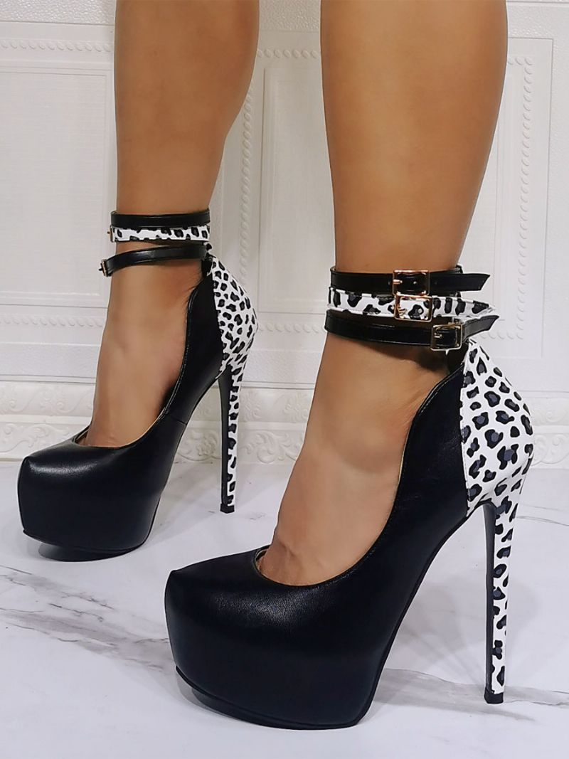 Damskie Seksowne Szpilki CZarne Okrągłe Toe Pu Skórzane Obcasy Z Paskiem Na Kostkę