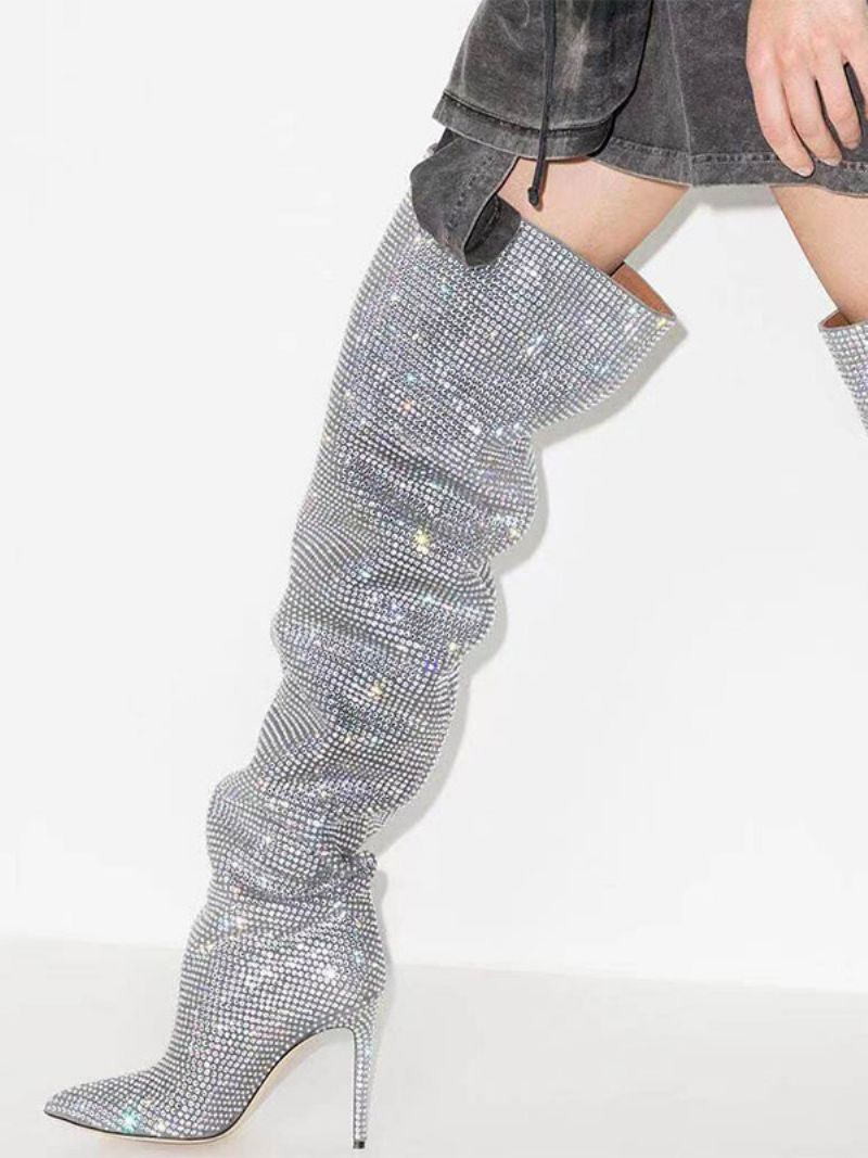 Damskie Srebrne Buty Za Kolano Dżetów Szpiczaste Udo Wysokie Imprezowe
