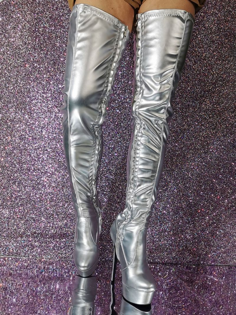 Damskie Srebrne Buty Za Udo Na Platformie Z Okrągłym Noskiem I Wysokim Obcasem Zakolanówki