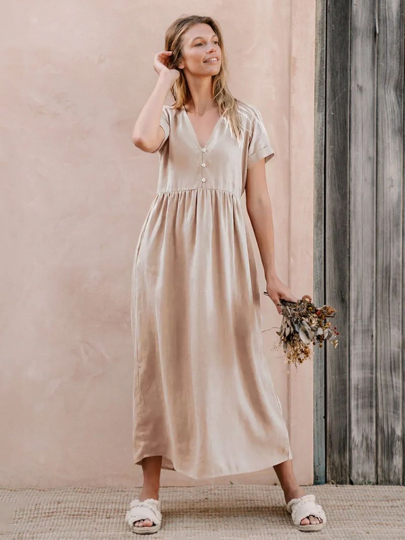 Damskie Sukienki Koktajlowe Morelowe Guziki Z Dekoltem W Kształcie Litery V Bawełniana Lniana Warstwowa Fantastyczna Sukienka Tuba Dla Dorosłych