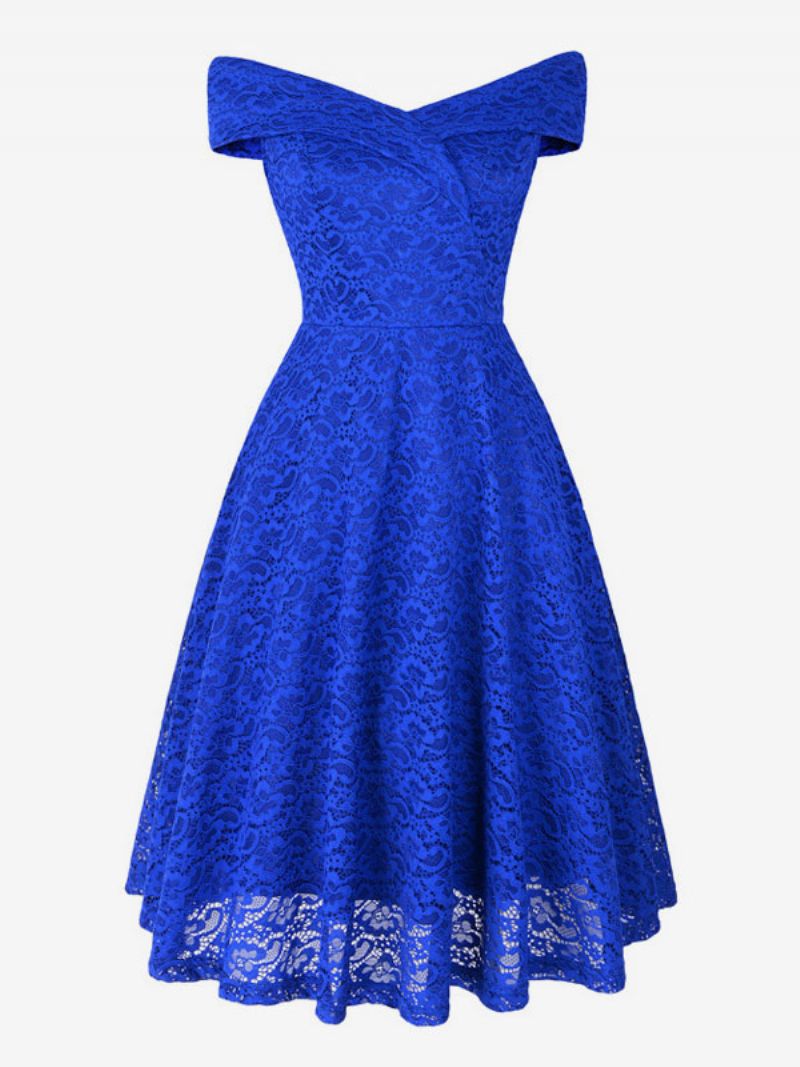 Damskie Sukienki Koronkowe Ciemnogranatowy Dekolt W Kształcie Litery V Bez Rękawów Z Odkrytymi Ramionami Koronkowy Drążony Kopertowy Strój Stylu Retro