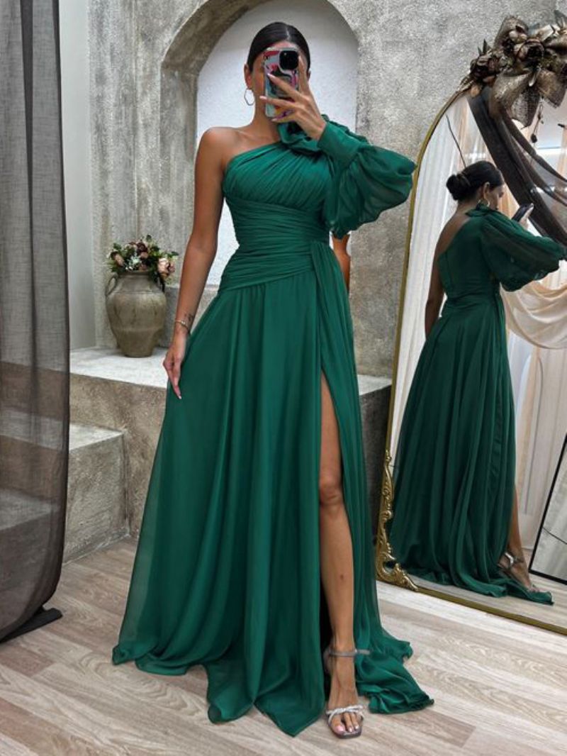 Damskie Suknie Balowe Maxi Plisowana Sukienka Koktajlowa Na Jedno Ramię Z Wysokim Rozcięciem W Jednolitym Kolorze