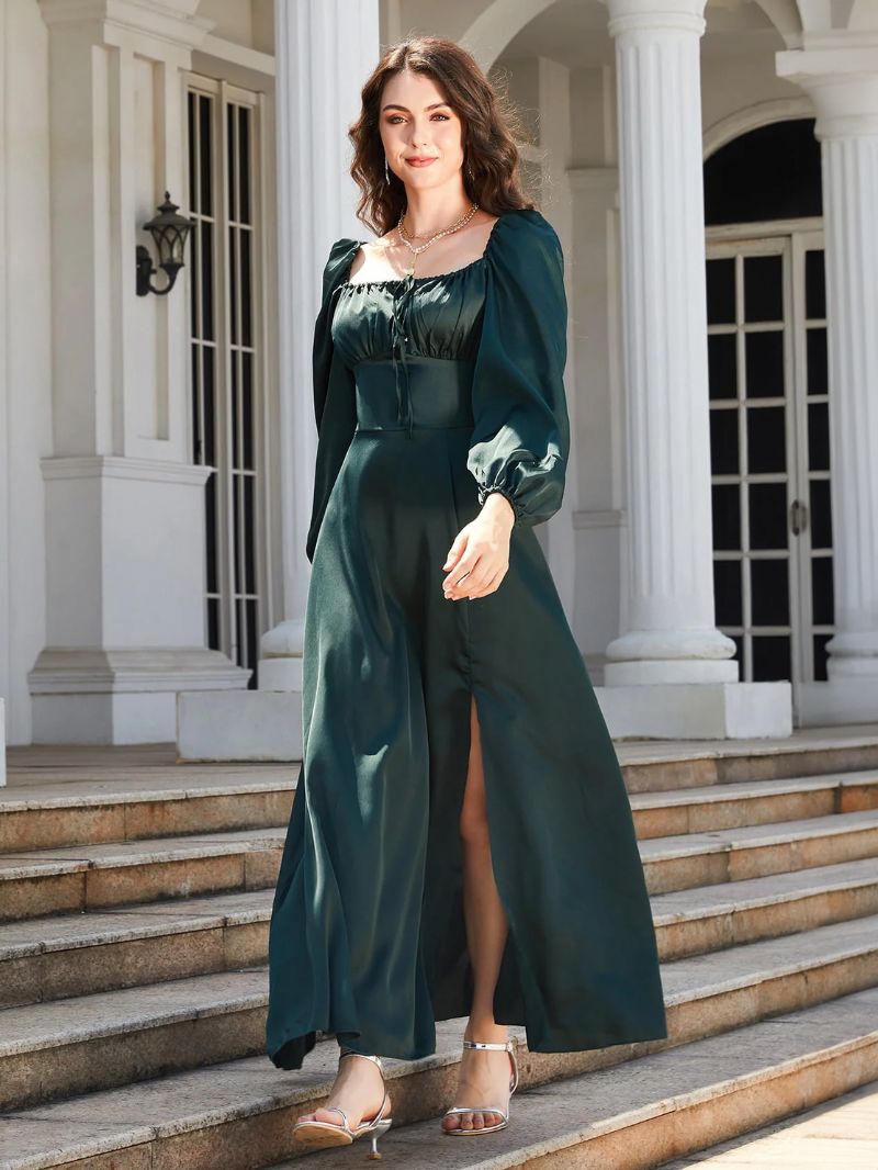 Damskie Zielone Sukienki Imprezowe Marszczony Stanik Kwadratowy Dekolt Z Wysokim Rozcięciem Sukienka Maxi Na Studniówkę
