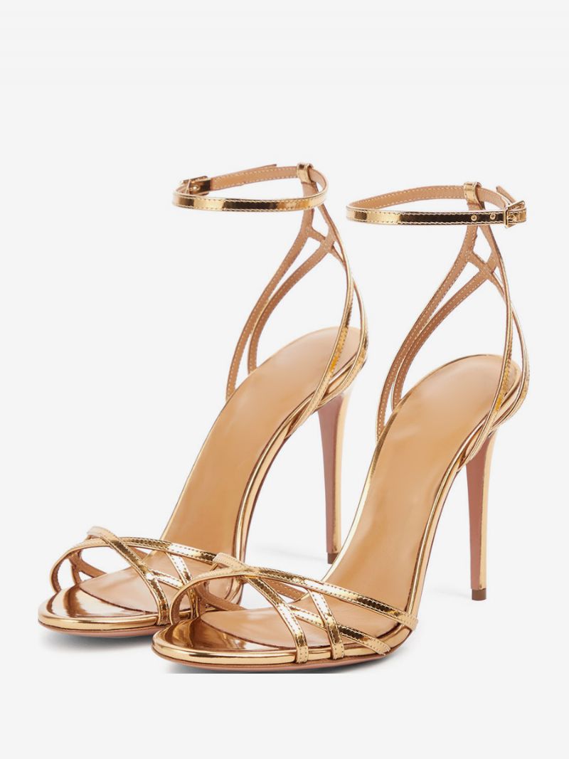 Damskie Złote Buty Imprezowe Metaliczne Sandały Na Wysokim Obcasie Z Odkrytymi Palcami I Krzyżowanymi Paskami Kostce