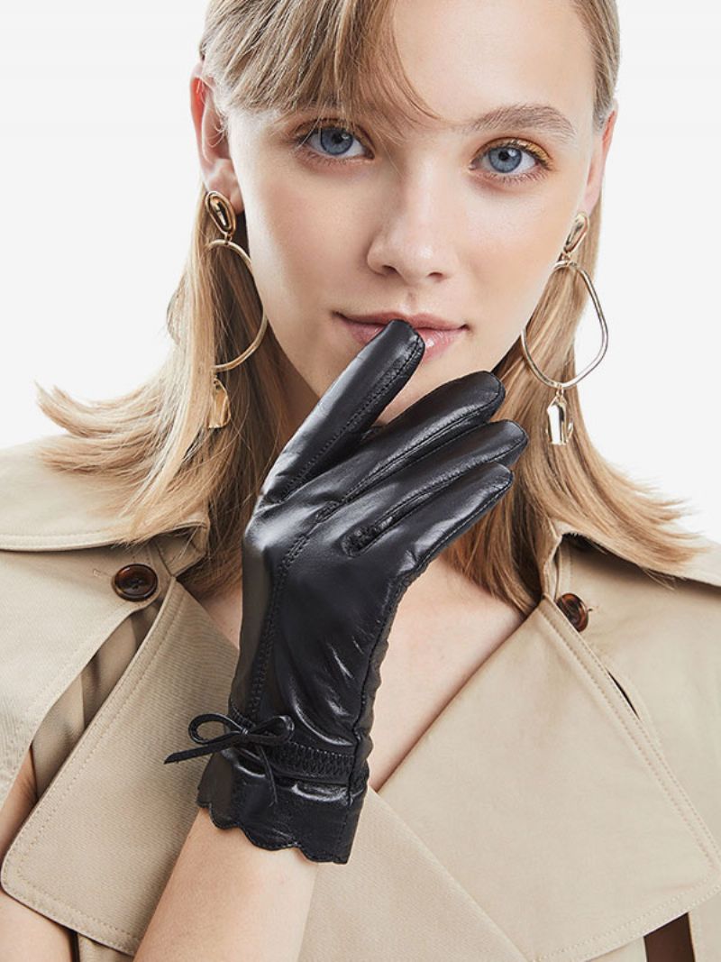 Kokardy Damskie Ciepłe Podgrzewane Zimowe Skórzane Wodoodporne Krótkie Rękawiczki Dla Kobiet - Czarny