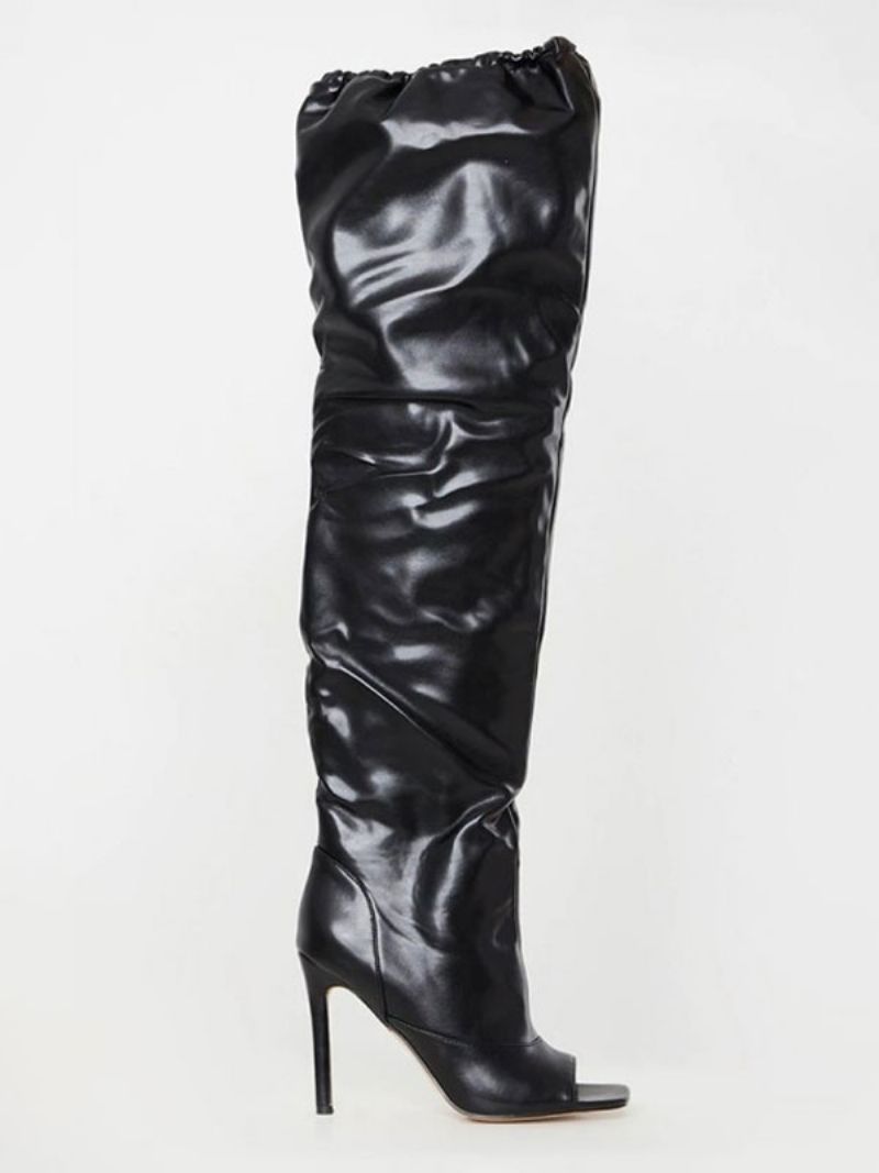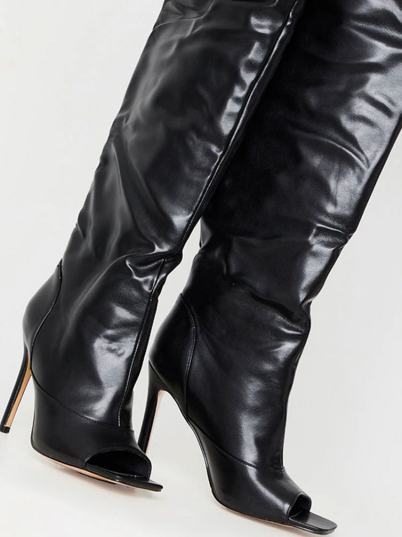 Kozaki Damskie Za Udo CZarne Skórzane Buty Z Odkrytymi Palcami Na Szpilkach