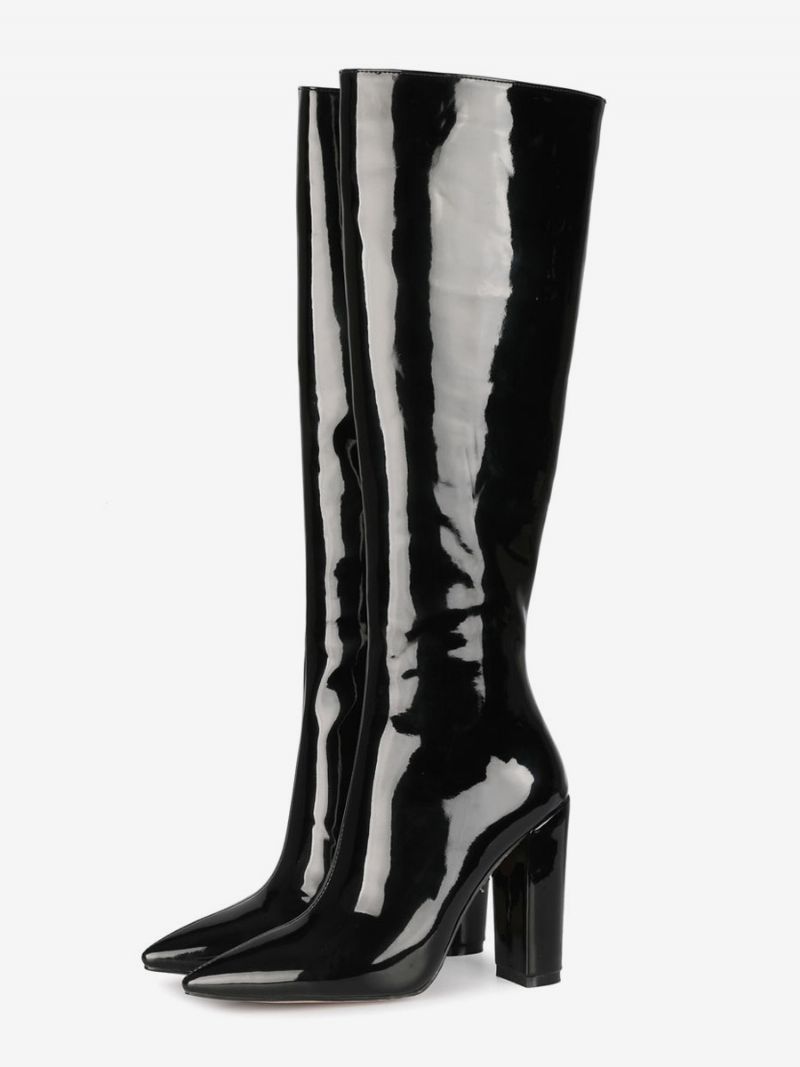 Kozaki Do Kolan Skórzane CZarne Szpiczaste Noski Jasne Buty Na Grubym Obcasie Dla Kobiet