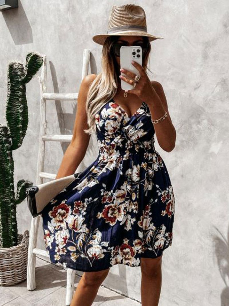 Letnia Sukienka Damska Biała Plażowa Midi Z Dekoltem W Szpic I Kwiatowym Nadrukiem