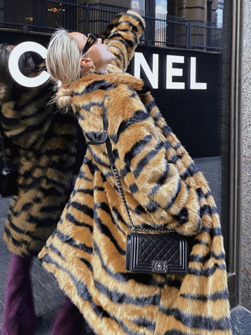 Płaszcz Ze Sztucznego Futra Z Nadrukiem Tygrysa Zimowa Odzież Wierzchnia Midi Dla Kobiet 2024