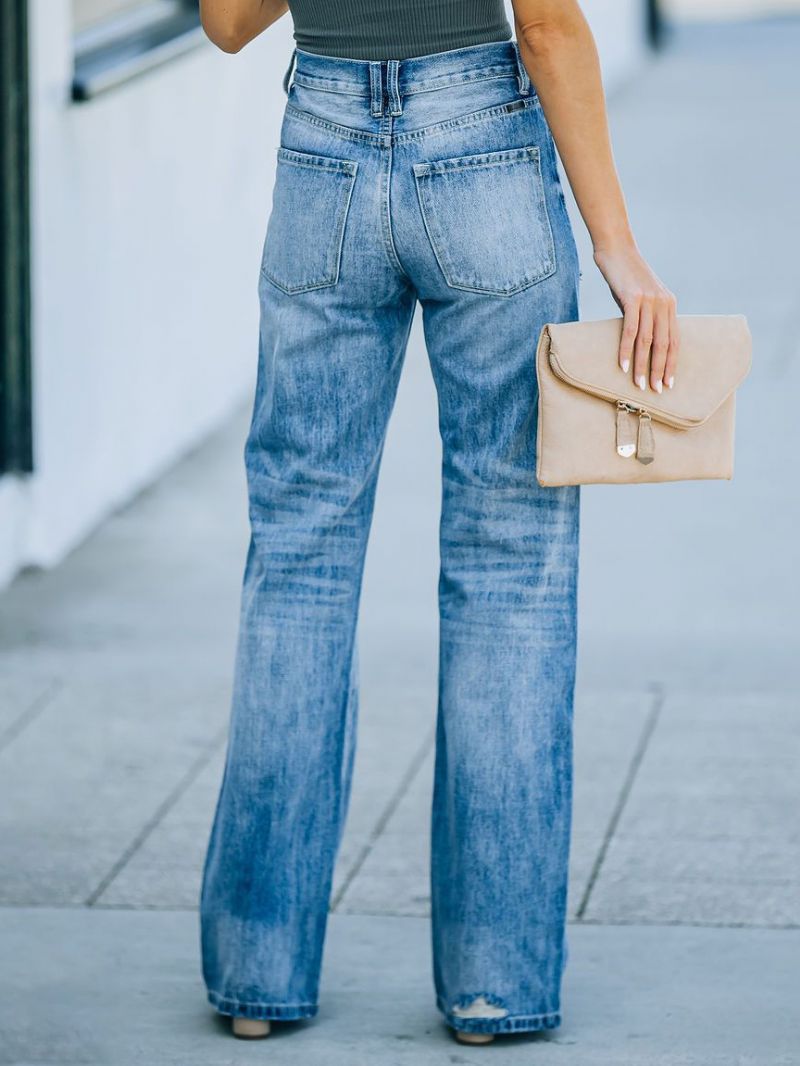 Proste Dżinsy Damskie Z Wysokim Stanem I Przetarciami Na Wiosnę 2024