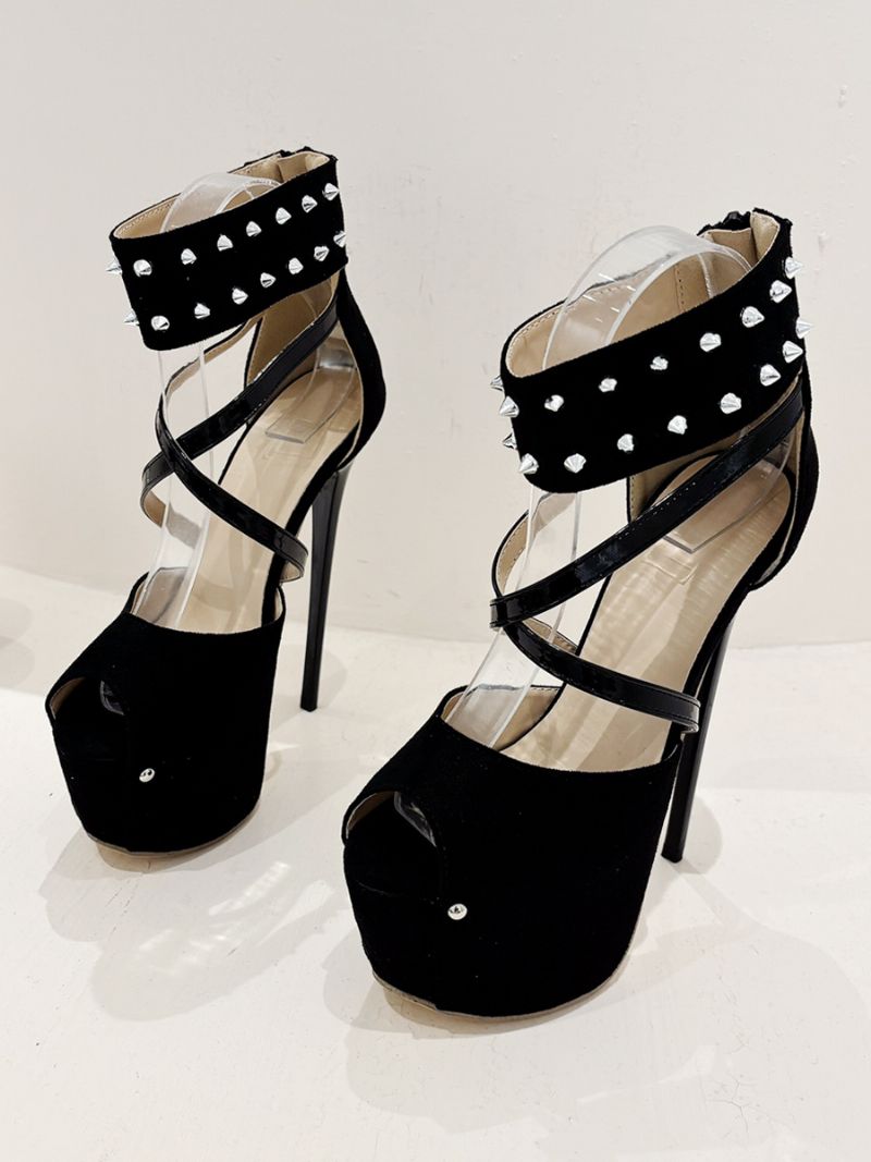 Seksowne Sandały Damskie CZarne Mikro Zamszowe Górne Peep Toe 2 "nity 5 5" Buty