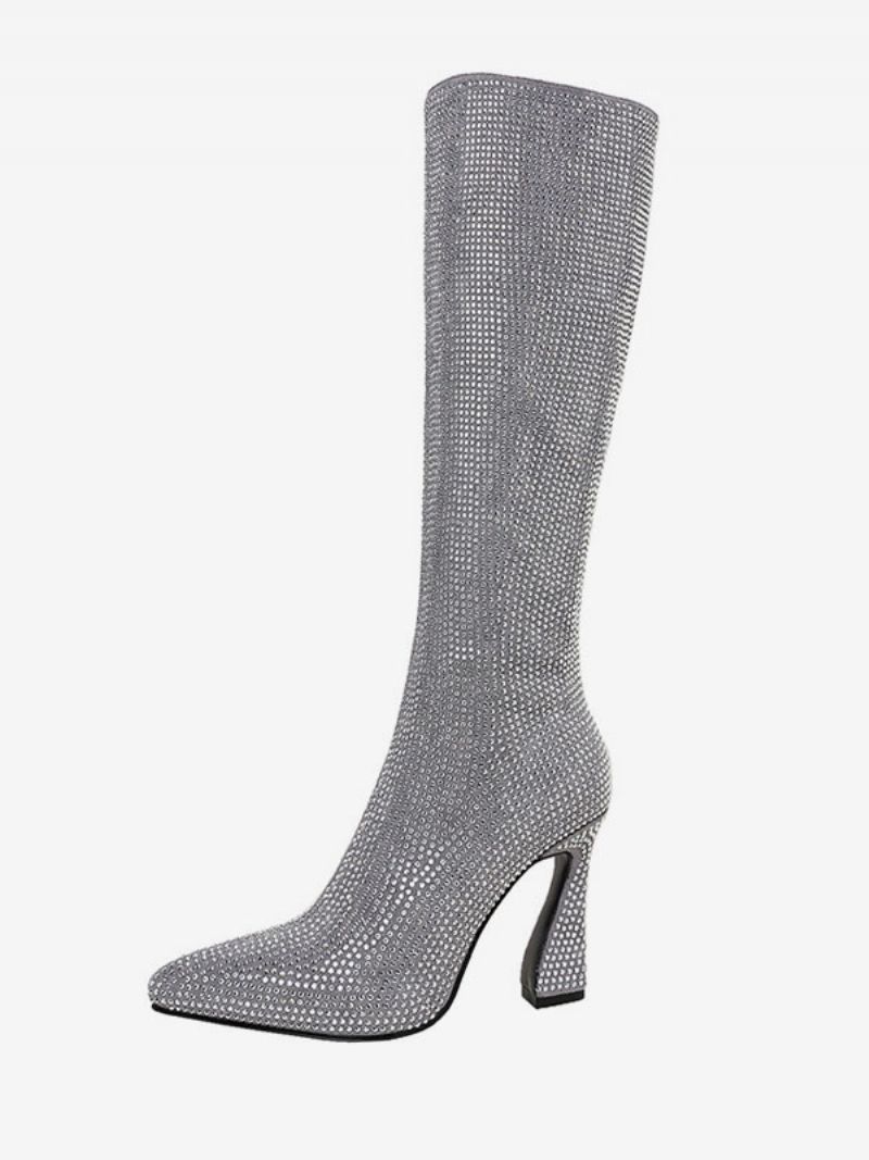 Srebrne Buty Do Kolan Damskie Z Dżetów Ze Szpiczastym Noskiem Szpulowe Na Obcasie