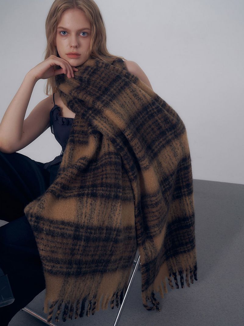 Wełniany Szalik W Kratę Z Frędzlami Jesienno-zimowy Szal Dla Kobiet